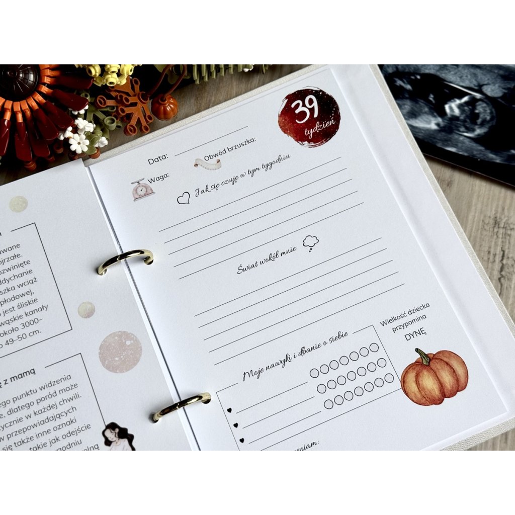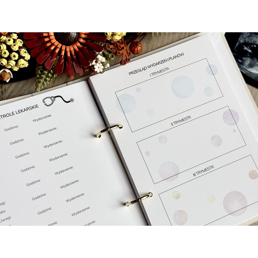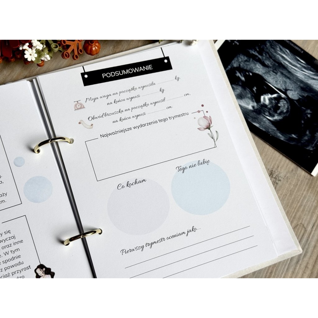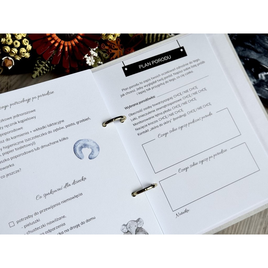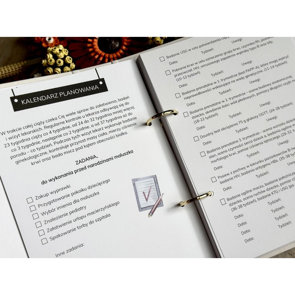 Znajdziesz w nim miejsce na planowanie, praktyczne notatki oraz uchwycenie najpiękniejszych chwil – od pierwszych objawów aż po narodziny dziecka.